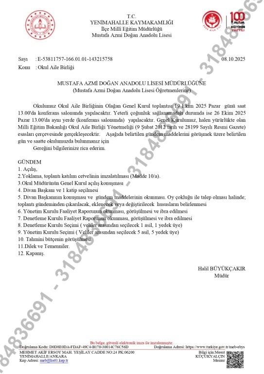 19.10.2025 OKUL AİLE BİRLİĞİ TOPLANTISI DUYURUU