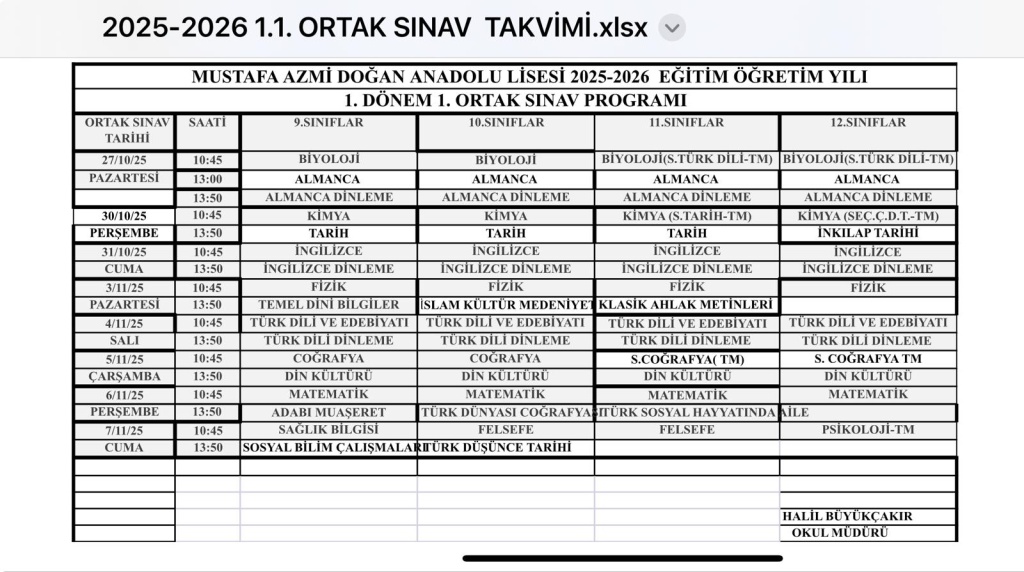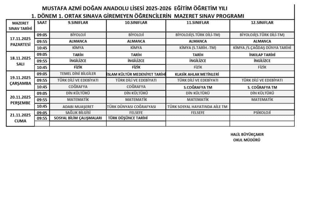 2025-2026 Eğitim Öğretim Yılı 1. Dönem 1. Sınavlar ve Mazeret Sınavları Takvimi